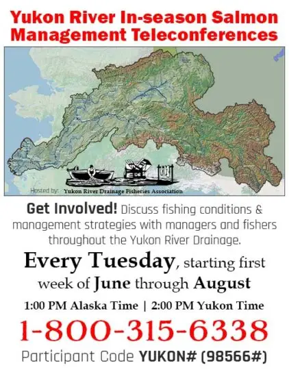 The YRDFA In-Season Teleconference season is beginning! Our first call will be on June 4 at 1:00 PM Alaska/2:00 PM Yukon Time. We encourage all fishery users to call in to voice their concerns of the Yukon River drainage fisheries. The in-season salmon management teleconferences offer stakeholders the opportunity to get first-hand information during the […]