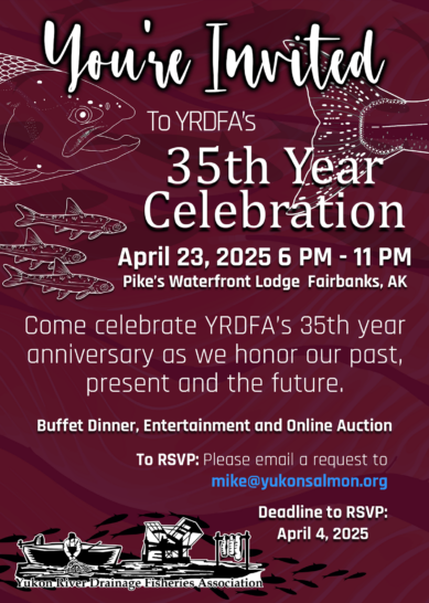 You’re Invited to the Yukon River Drainage Fisheries Association 35th Anniversary Celebration! Come celebrate our 35th year anniversary as we honor YRDFA’s past, present and future. The celebration is at Pike’s Waterfront Lodge, Binkley Room in Fairbanks, Alaska on April 23, 2025 from 6 PM to 11 PM. There will be a buffet dinner, entertainment